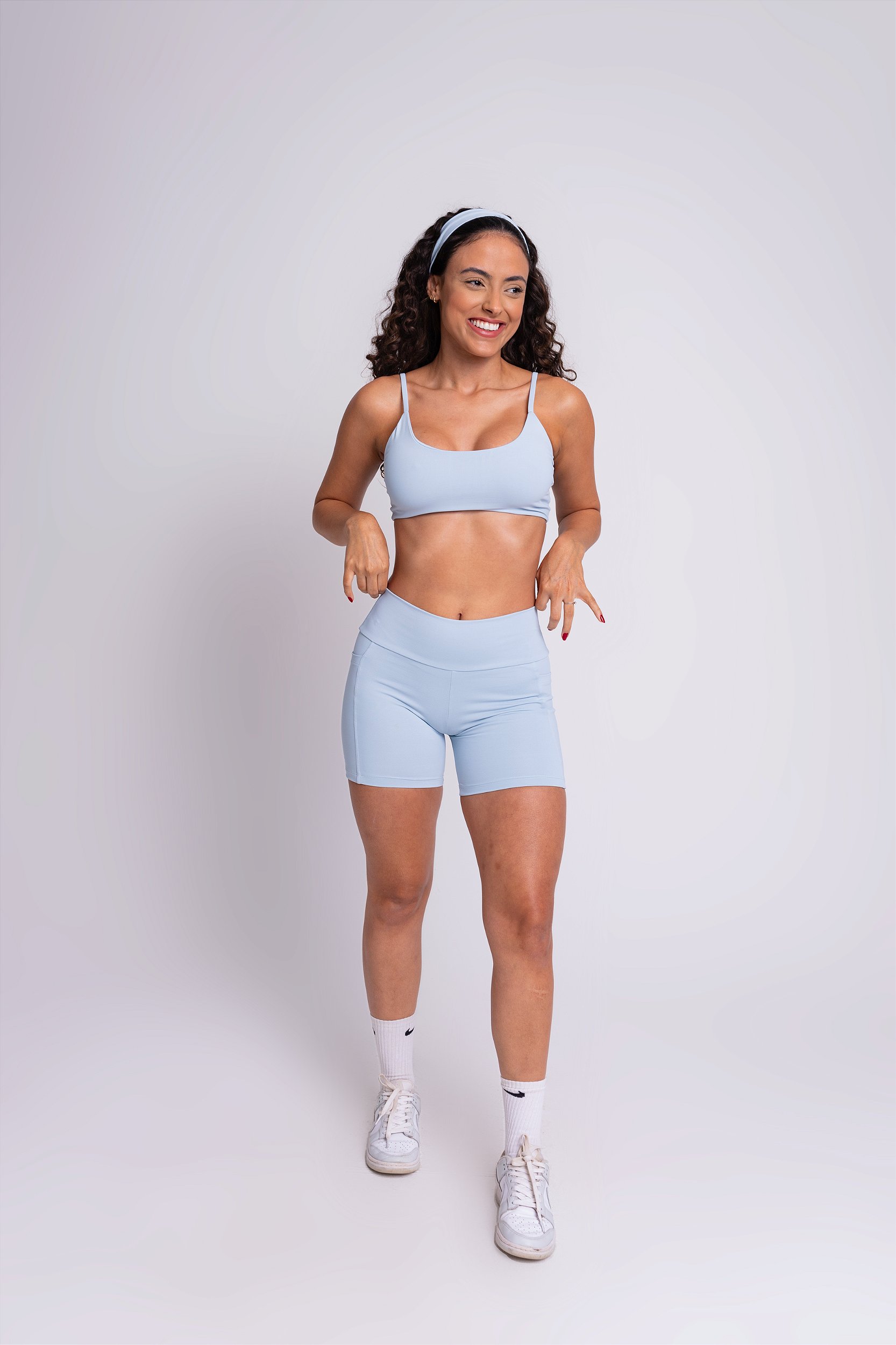 Na cor azul claro, o conjunto transmite leveza e modernidade, sendo fácil de combinar com tenis e acessórios esportivos. Ideal para quem busca praticidade sem abrir mão do estilo.