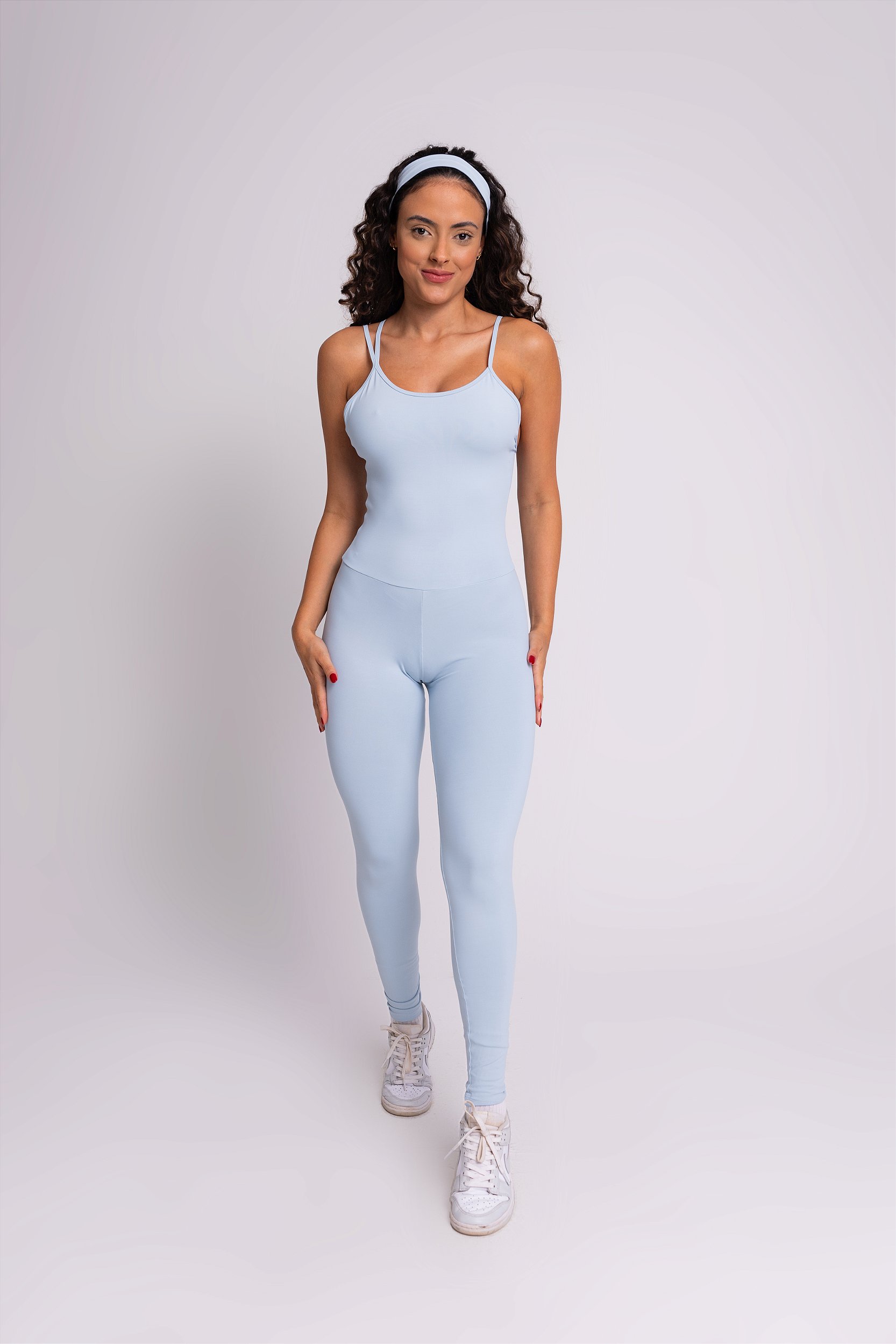 O modelo tem um caimento justo ao corpo, realçando a silhueta, e a modelagem sem costuras aparentes contribui para um ajuste perfeito. A cor azul claro transmite suavidade e versatilidade, combinando facilmente com diversos acessórios e calçados.